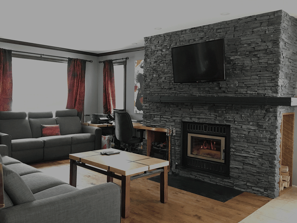 Ce salon requérait l’ajout d’un espace bureau. Et pourquoi ne pas en profiter pour y ajouter un grand foyer, afin de rafraîchir l’espace.